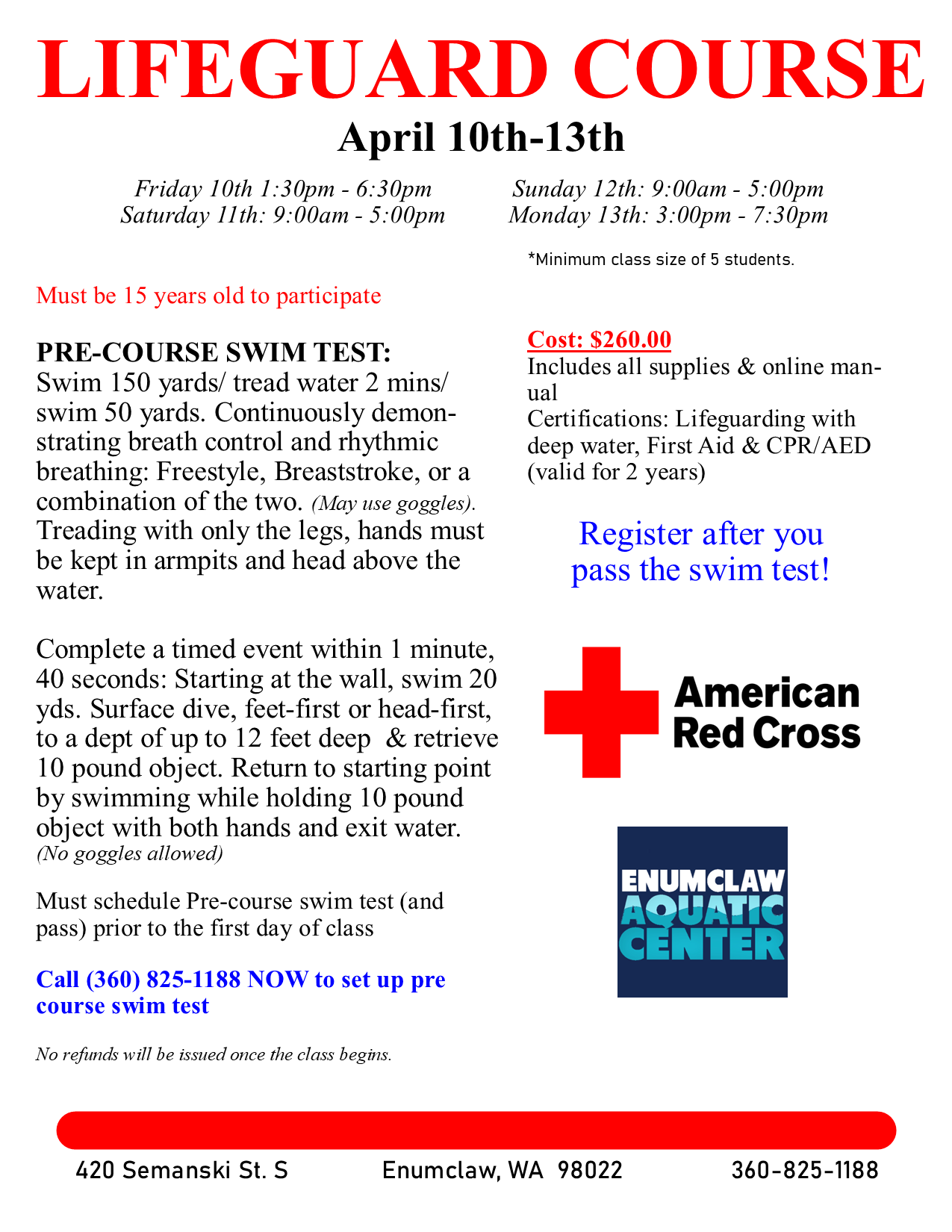 WE ARE HIRING! Must be American Red Cross Lifeguard or Water Safety Instructor Certified. Current Classes are listed under Training Courses.